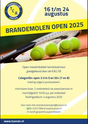We hopen dat jullie allemaal een geweldige zomer hebben en volop genieten van het tennisseizoen! We hebben spannend nieuws voor jullie. Het is weer tijd voor het jaarlijkse hoogtepunt van onze club: de Brandemolen Open!